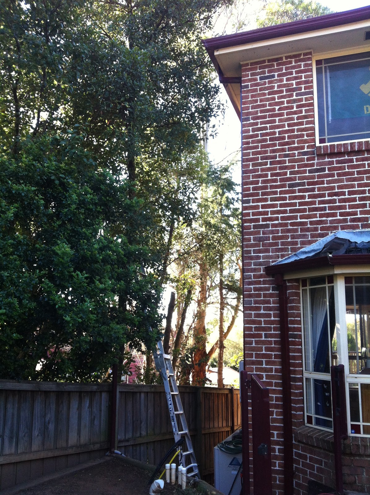 Down one side of our house we have a few tall trees from our neighbour’s yard that sit very close to the fence. During the last big storm here these trees were swaying so badly they were smacking the side of the house. It was very loud and unfortunately caused one of the roof tiles to break off and fall onto the path below. The Provider went over to the neighbour’s for a chat and they both agreed – it was time to give those babies a decent chop!